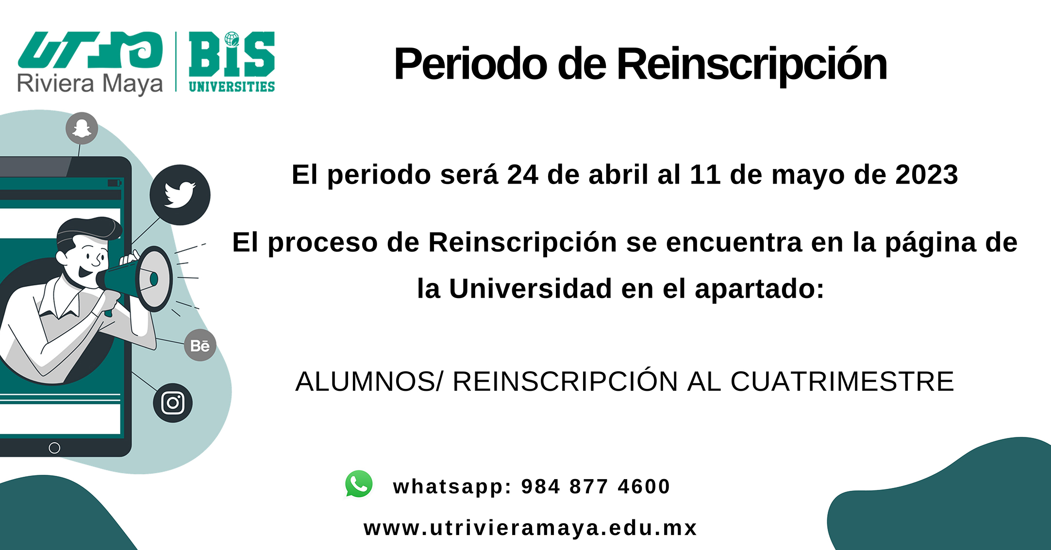 Si tienes alguna duda puedes enviarnos un whatsapp o llamarnos al 984 877 46 00 ext. 1408 en un horario de 10:00 a 21:00 horas de lunes a viernes.